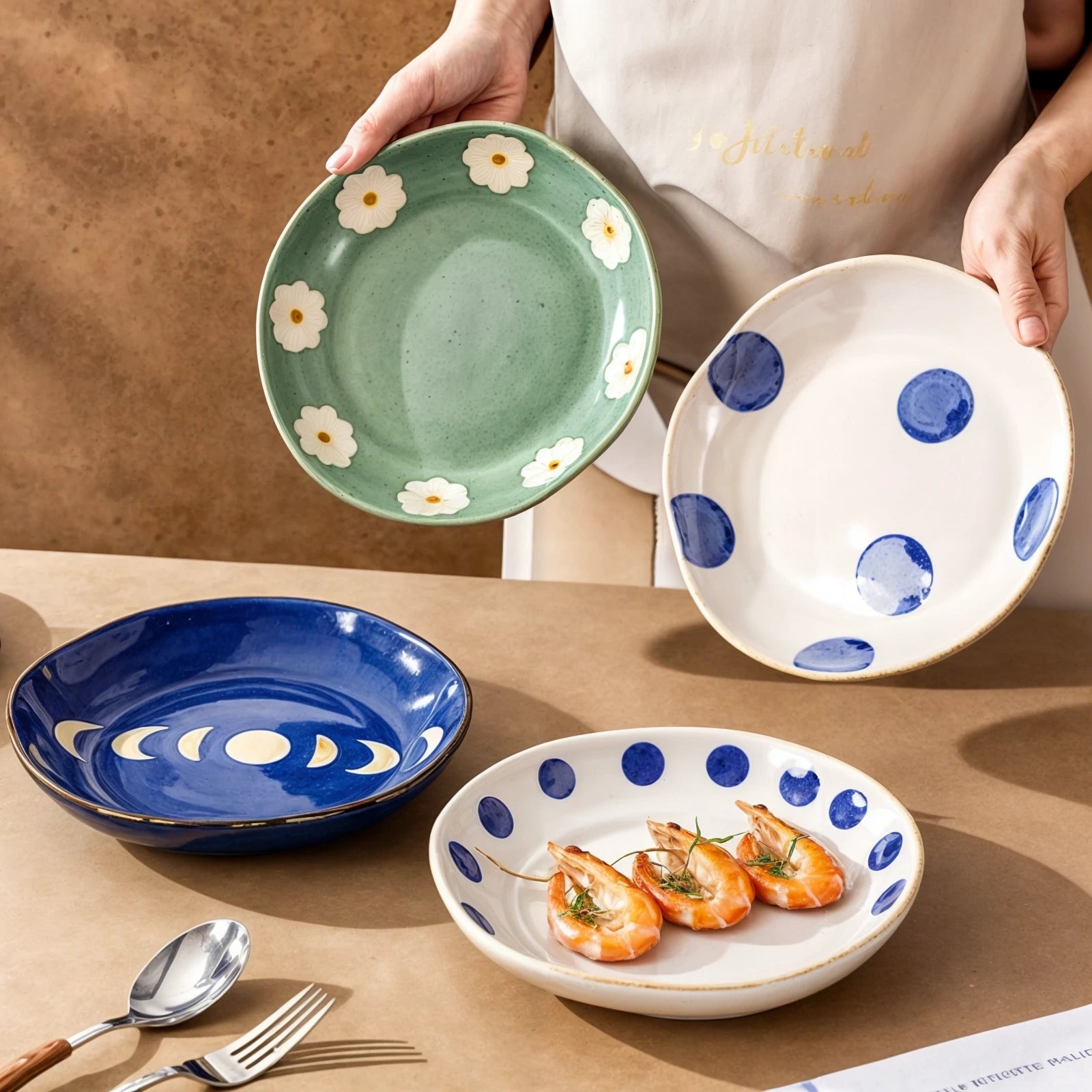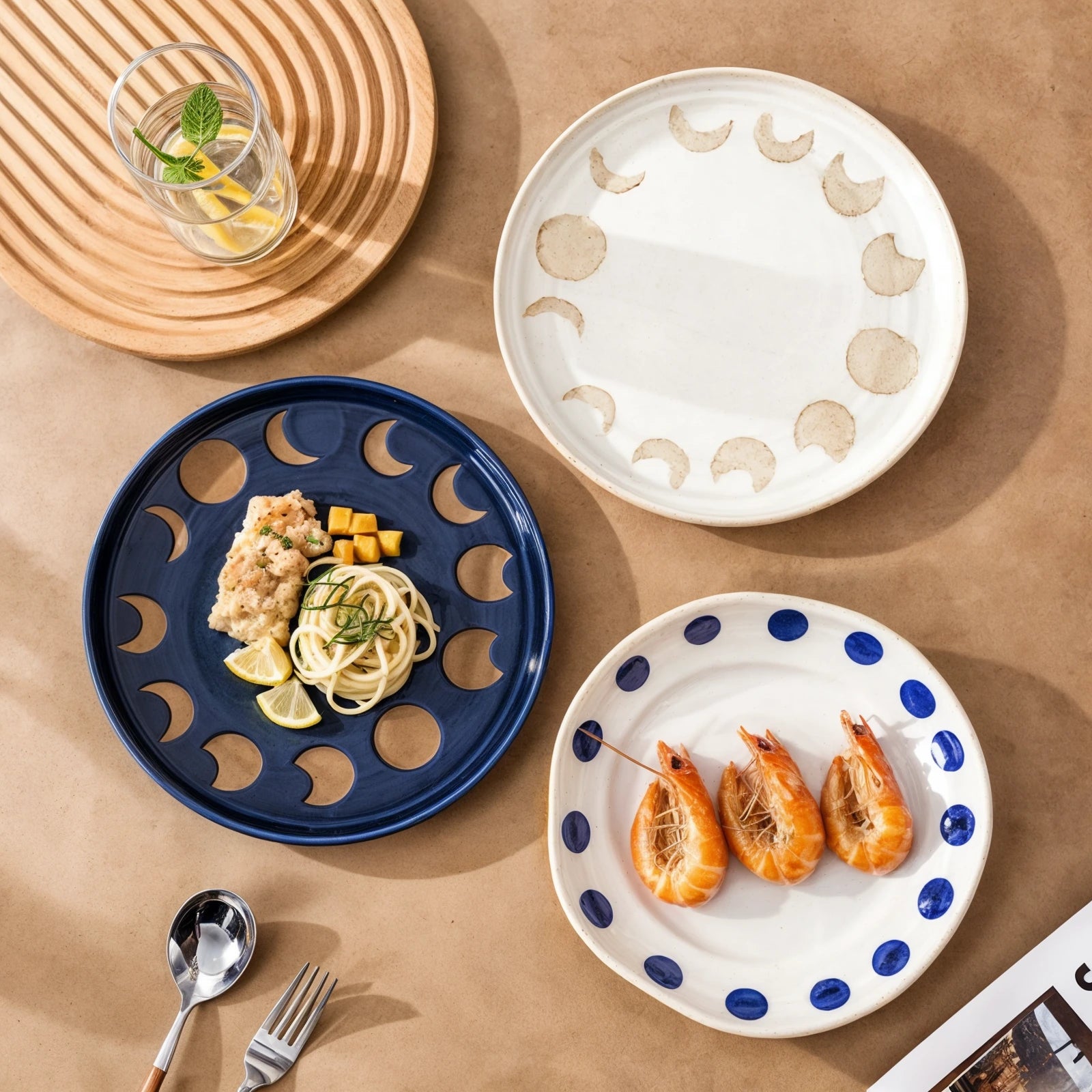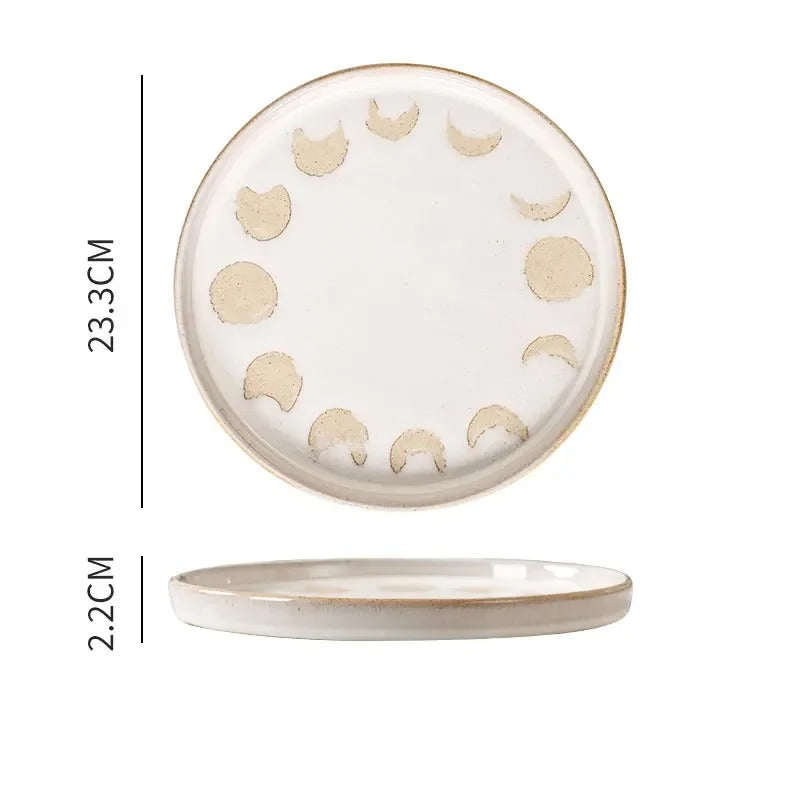 Each plate is hand-painted with playful motifs inspired by moon phases. flowers and coastal light. The organic. slightly irregular edges give them a natural charm. like ceramic pieces found in artisan markets by the sea.