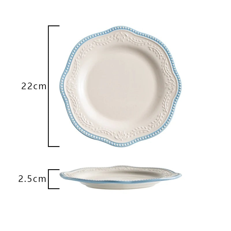 The delicate embossed olive branch motif pays homage to Salaterra’s Mediterranean spirit. The gently scalloped rim and dotted border add charm and character — a fresh take on a timeless pattern.