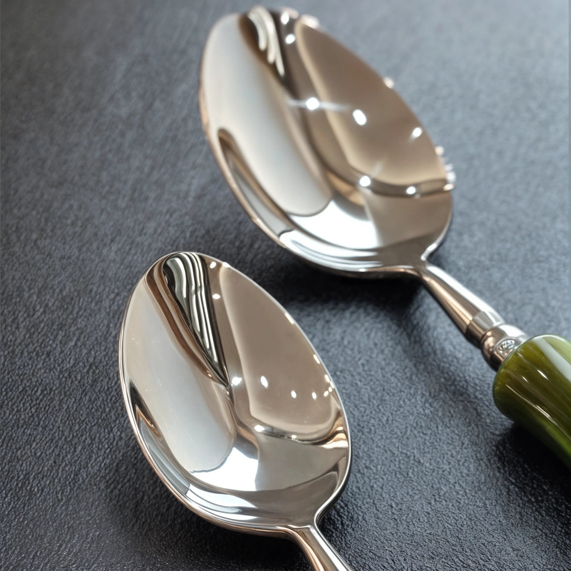 Inspired by the lush hills and stone streets of Valldemossa. this set features pearlescent green resin handles that shimmer softly. paired with sleek stainless steel heads. The knife’s sculptural. tapered blade adds a contemporary edge to every place setting.